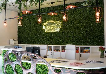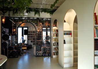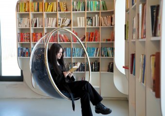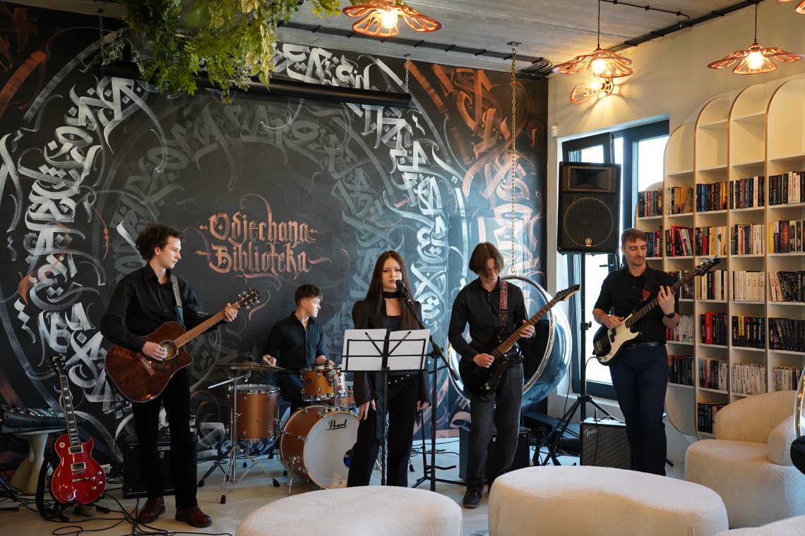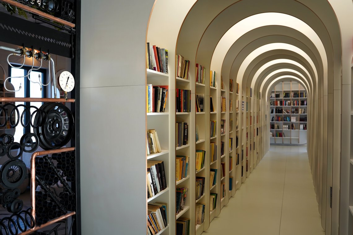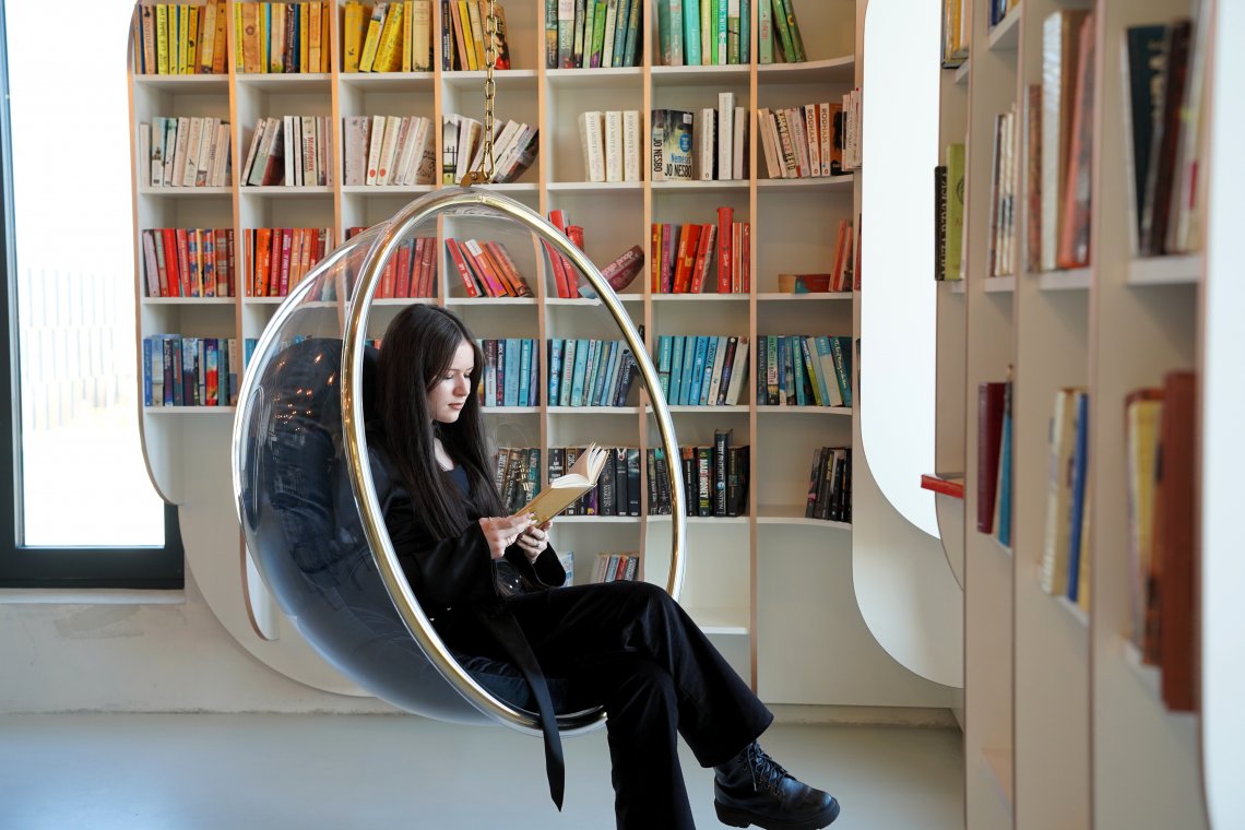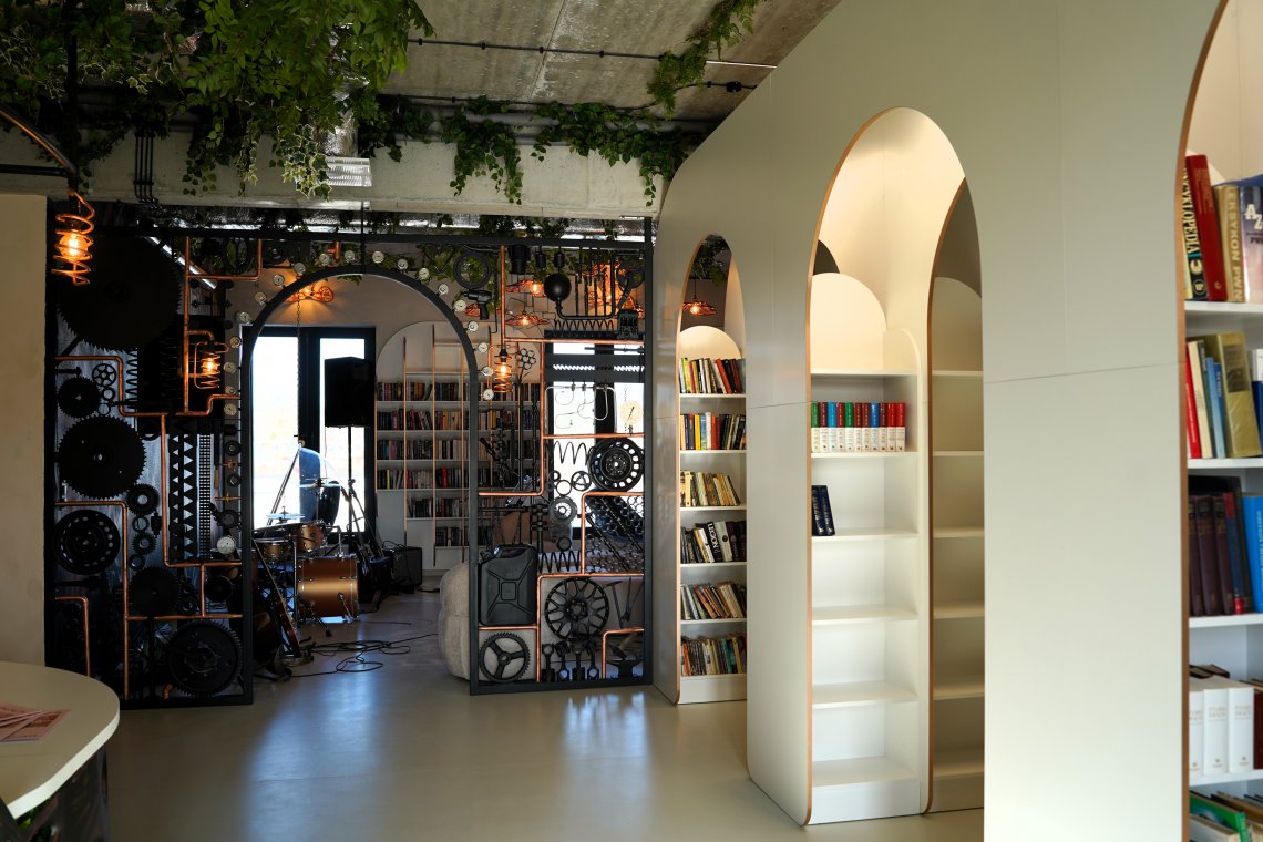 Miejsce to już od pierwszego spojrzenia przyciąga uwagę niebanalnym wystrojem oraz harmonijną aranżacją, łączącą funkcję tradycyjnej wypożyczalni z ogólnodostępną strefą pracy i relaksu dla uczniów. Industrialne akcenty, elementy street artu, starannie zaprojektowane oświetlenie i ściana zieleni tworzą atmosferę sprzyjającą zarówno skupieniu, jak i twórczej pracy. Białe regały, wygodne miejsca do nauki i odpoczynku oraz funkcjonalne rozwiązania sprawiają, że całość tworzy spójną i inspirującą przestrzeń.